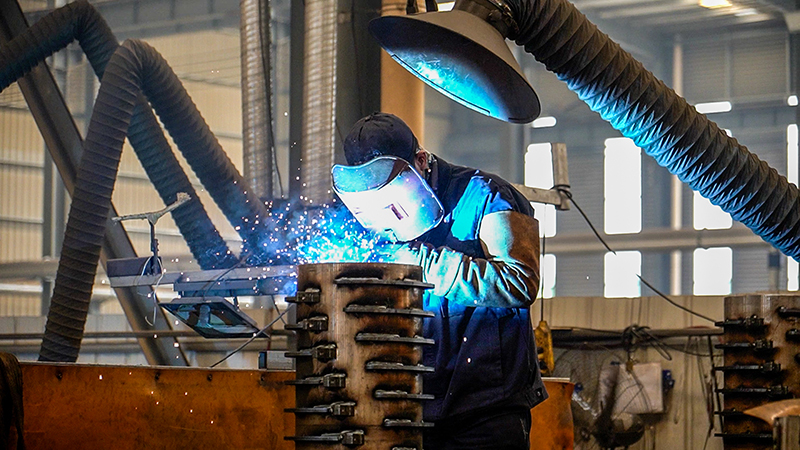 In the welding zone, welders are focused on their tasks, with blue welding arcs flickering intermittently. The seasoned craftsmen demonstrate their expertise, ensuring each weld is uniform and aesthetically pleasing.