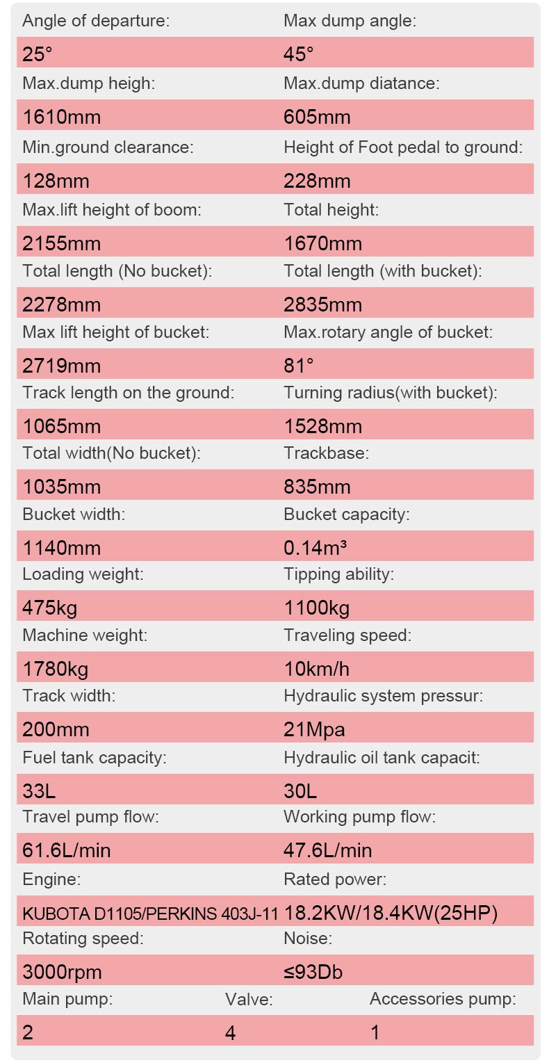 Equipped with either the Kubota D1105 or Perkins 403J-11 engine, rated power reaches 18.2 kW/18.4 kW (25 HP). The 3000 rpm speed ensures sustained, stable power delivery. A hydraulic system pressure of 21 MPa, combined with a working pump flow rate of 47.6 L/min and a travel pump flow rate of 61.6 L/min, ensures swift and powerful responses for boom lifting, bucket tilting, and other operations. The dual main pumps plus auxiliary pump configuration further boosts operational efficiency, effortlessly handling high-intensity continuous work demands.