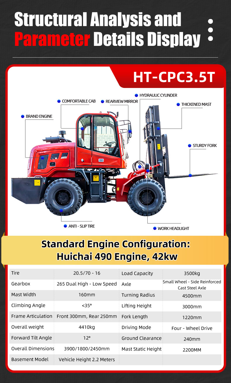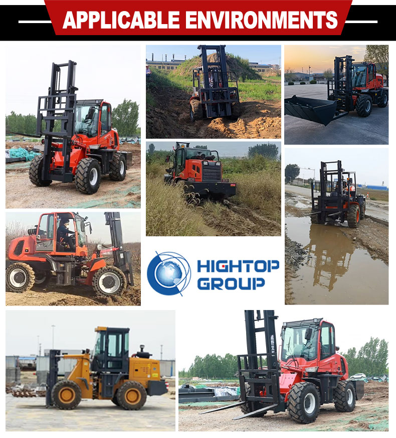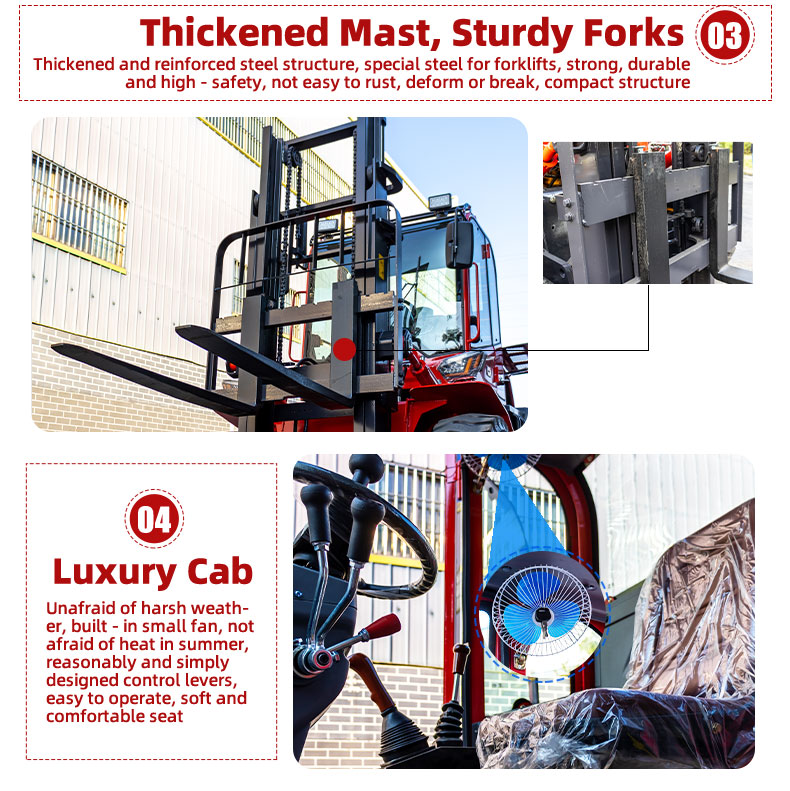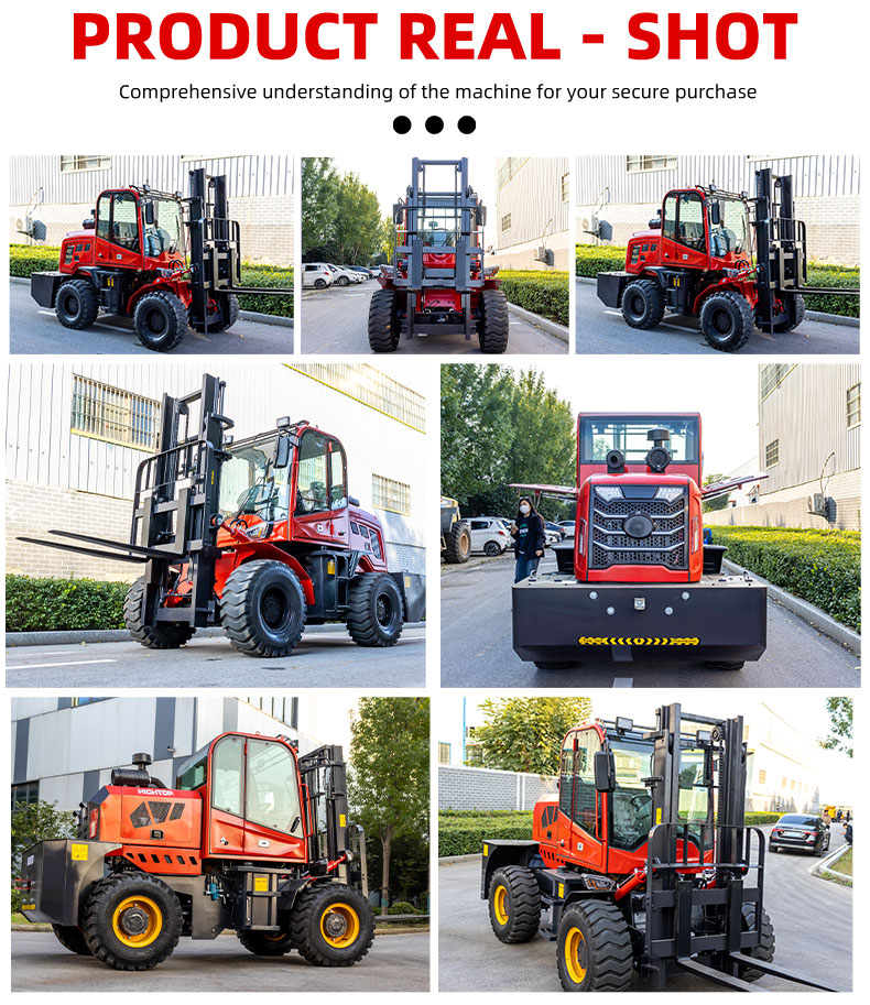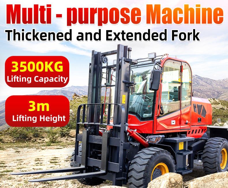 Off-road forklift, also known as field forklift, is the equipment for loading and unloading materials in airports, docks, stations and other material distribution centers with poor road conditions, which has good mobility and off-road reliability. The speed of off-road forklifts is higher than that of ordinary forklifts, and their maneuverability is obvious; The off-road forklift engine has high power, all-wheel drive and off-road tires, so it can drive on hills, mountains, beachheads, sand, snow, ice and muddy roads, and has good off-road performance. There are several types of off-road forklift frames, side beam type and middle articulated type, and the gantry is available in straight gantry type, hydraulic telescopic boom type and connecting rod forward type, etc., which can ensure reliability in operation. Features: The body is wide and can carry irregular and wide cargo. High ground clearance allows you to jump over obstacles on the field. There is a four-wheel drive function to work on muddy fields. Applicable occasions: construction sites, mines, orchards and pastures, industrial and mining enterprises with rough road surfaces.