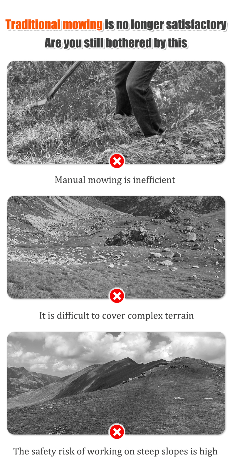 ✅ Complex terrain in mountainous and hilly areas ✅ Sloped orchard and lawn management ✅ Vegetation trimming along riverbanks and wetlands
