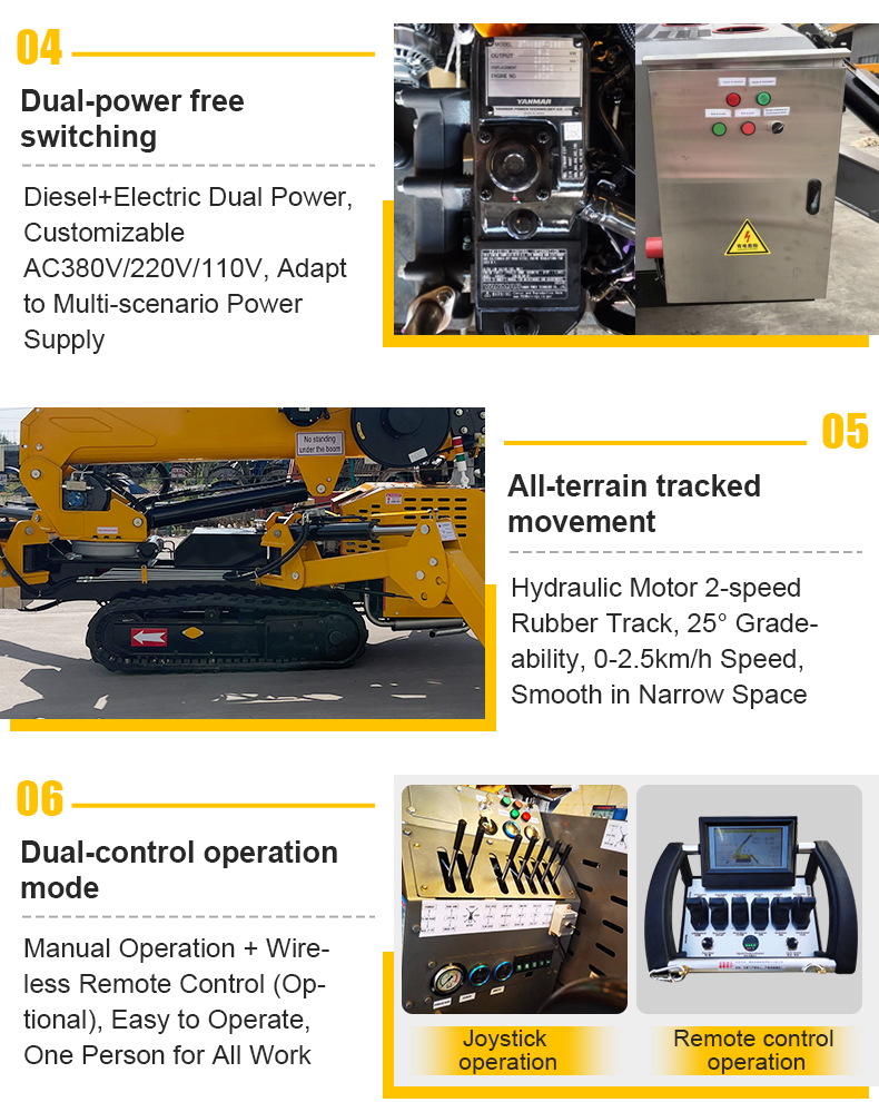 5-Section Full-auto Hexagonal Boom360° Continuous RotationHydraulic Track TravelElectric+Diesel Dual Power