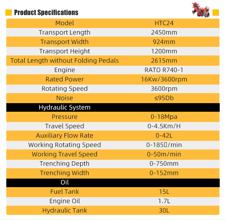 Trenching depth is adjustable from 0 to 750 mm, width from 0 to 152 mm, working travel speed from 0 to 50 m/min, and travel speed from 0 to 4.5 km/h. These parameters can be flexibly adjusted according to different soil conditions and pipeline laying requirements, meeting the needs of diverse engineering scenarios.