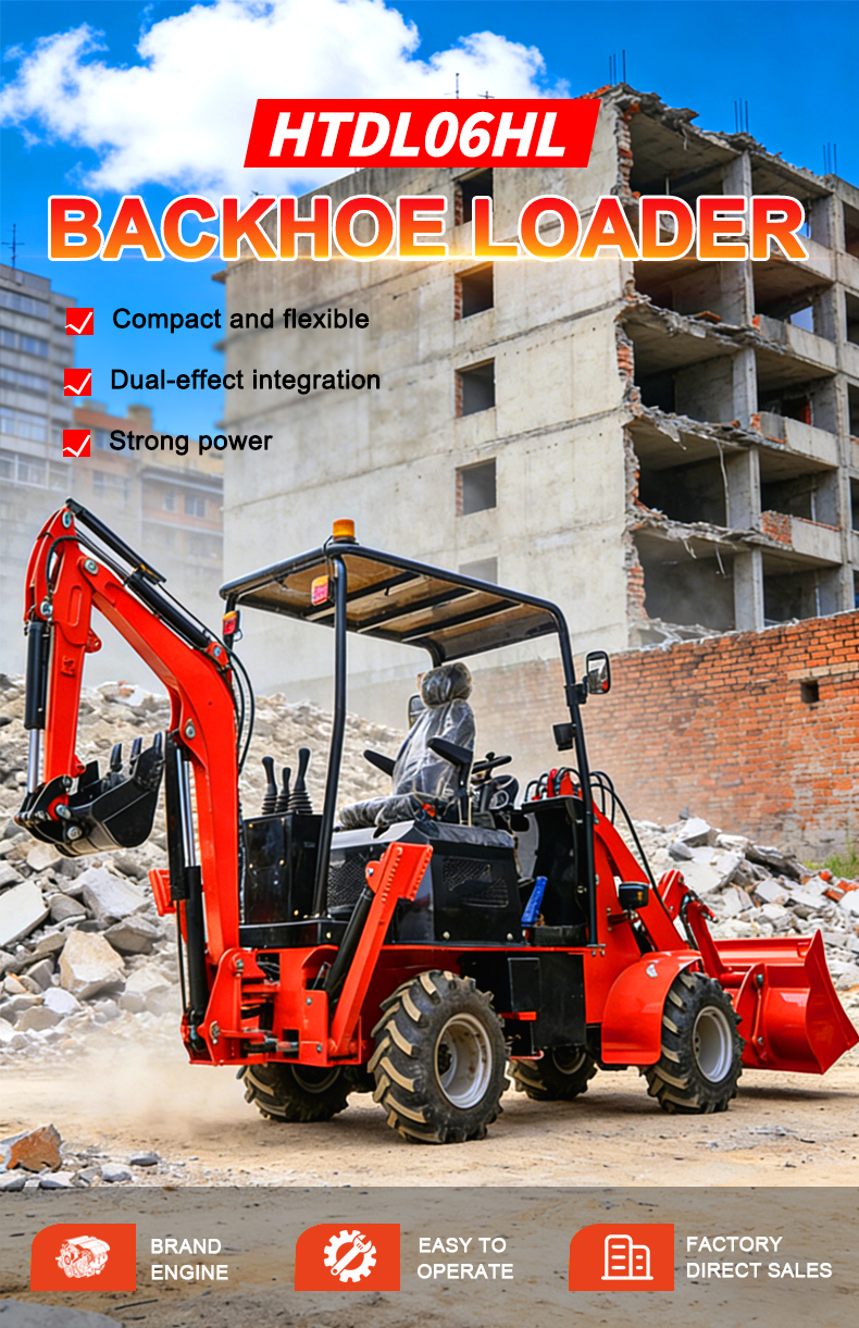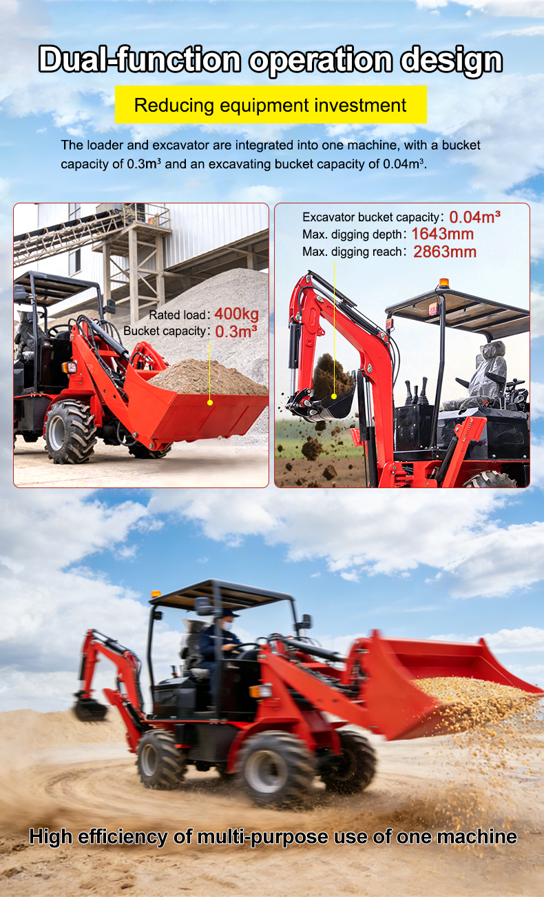Combines loader and excavator functions in one unit. Bucket capacity: 0.3 m³; rated load: 400 kg. Excavator bucket capacity: 0.04 m³; maximum digging depth: 1643 mm; digging reach: 2863 mm. Handles multiple scenarios—loading, excavation, and backfilling—with a single machine, reducing equipment investment.