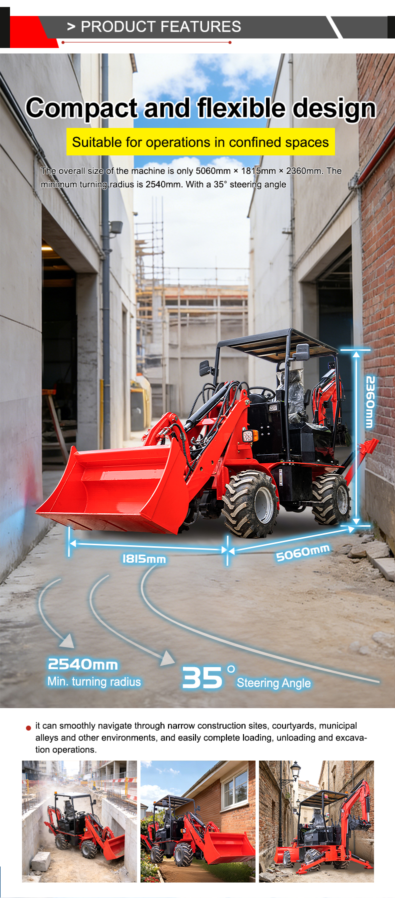 With overall dimensions of just 5060 mm × 1815 mm × 2360 mm and a minimum turning radius of 2540 mm, combined with a 35° steering angle, it can maneuver flexibly through narrow construction sites, courtyards, and municipal alleys, effortlessly completing loading, unloading, and excavation tasks.