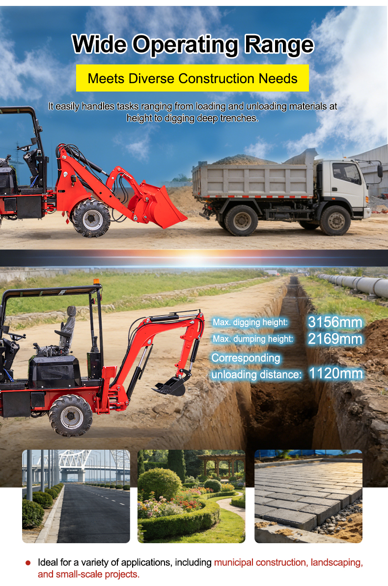 With a maximum digging height of 3,156 mm, a maximum unloading height of 2,169 mm, and a corresponding unloading reach of 1,120 mm, it effortlessly handles tasks ranging from high-altitude material handling to deep trench excavation, making it suitable for various applications including municipal construction, landscaping, and small-scale engineering projects.